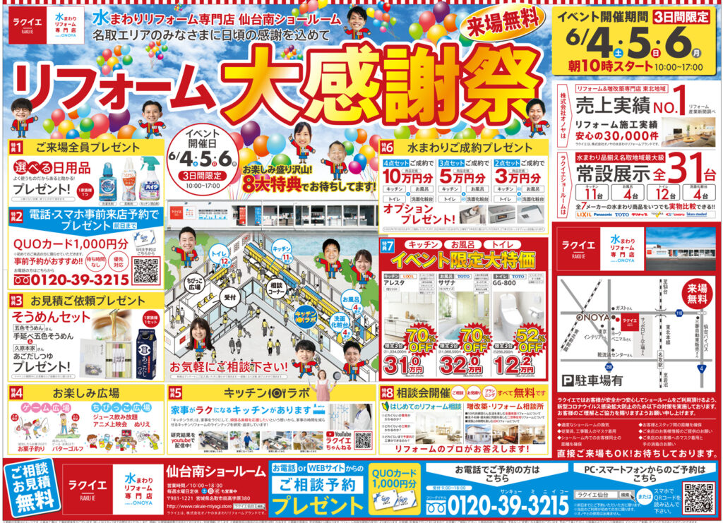 水まわりリフォーム専門店、ラクイエ多賀城ショールーム、仙台南ショールームでは、6/4(土)・5(日)・6(月)の3日間で「リフォーム大感謝祭」を開催いたします。イベントならではの特典が盛りだくさん!