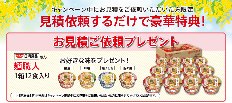 ・お見積依頼で「日清 麵職人」お好きな味を1箱プレゼント