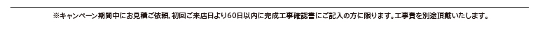 ※事前予約特典は、ご相談で500円、お見積で500円の最大1,000円とさせていただきます。※当店を初めてご利用の方に限らせて頂きます。※限定特別価格およびご成約特典は、初回ご来店日より60日以内に工事完了できる方に限らせていただきます。※特典およびイベント企画内容は、予告なしに変更になる場合がございます。※画像はすべてイメージです。※特典はアンケートすべてご記入いただいた方に限ります。